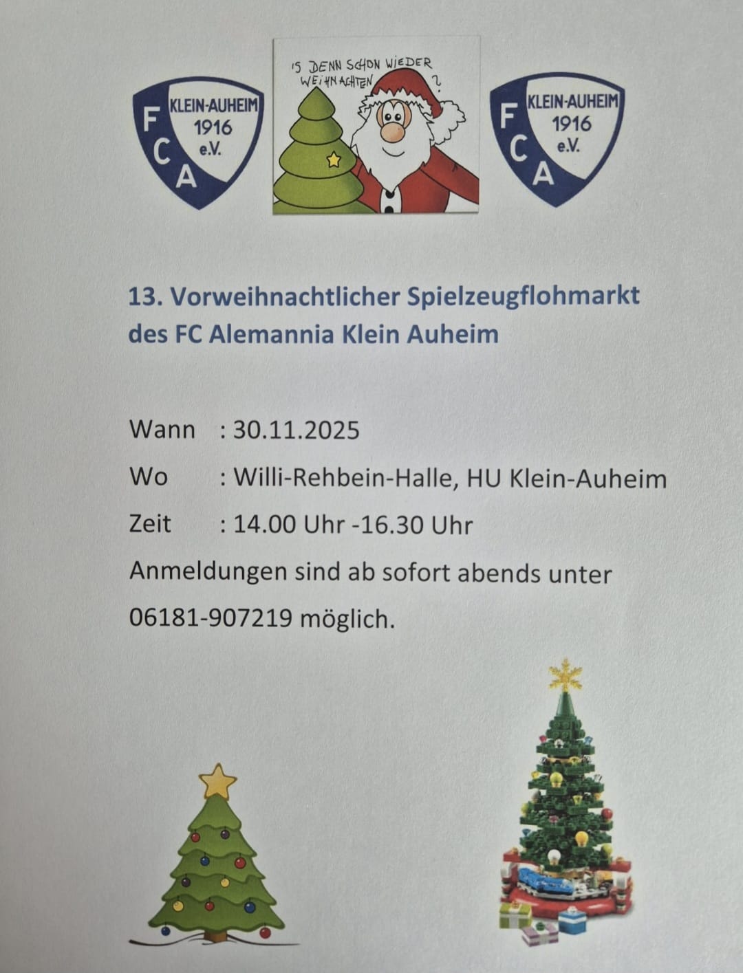 Am Sonntag, den 30. November 2025 veranstaltet der FCA einen vorweihnachtlichen Spielzeugflohmarkt.
