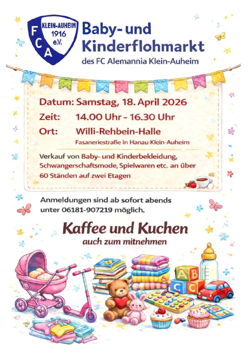 Der FCA veranstaltet am Samstag, 18. April 2026, einen Baby- und Kinderflohmarkt in der Willi-Rehbein-Halle